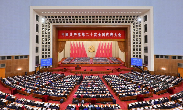 人民大会堂雄伟庄严,万人大礼堂气氛热烈。主席台上方悬挂着“中国共产党第二十次全国代表大会”的会标,后幕正中是镰刀和锤头组成的党徽,10面鲜艳的红旗分列两侧。二楼和三楼眺台上分别悬挂着“高举中国特色社会主义伟大旗帜,全面贯彻习近平新时代中国特色社会主义思想,弘扬伟大建党精神,为全面建设社会主义现代化国家、全面推进中华民族伟大复兴而团结奋斗!”“伟大、光荣、正确的中国共产党万岁!”的横幅。